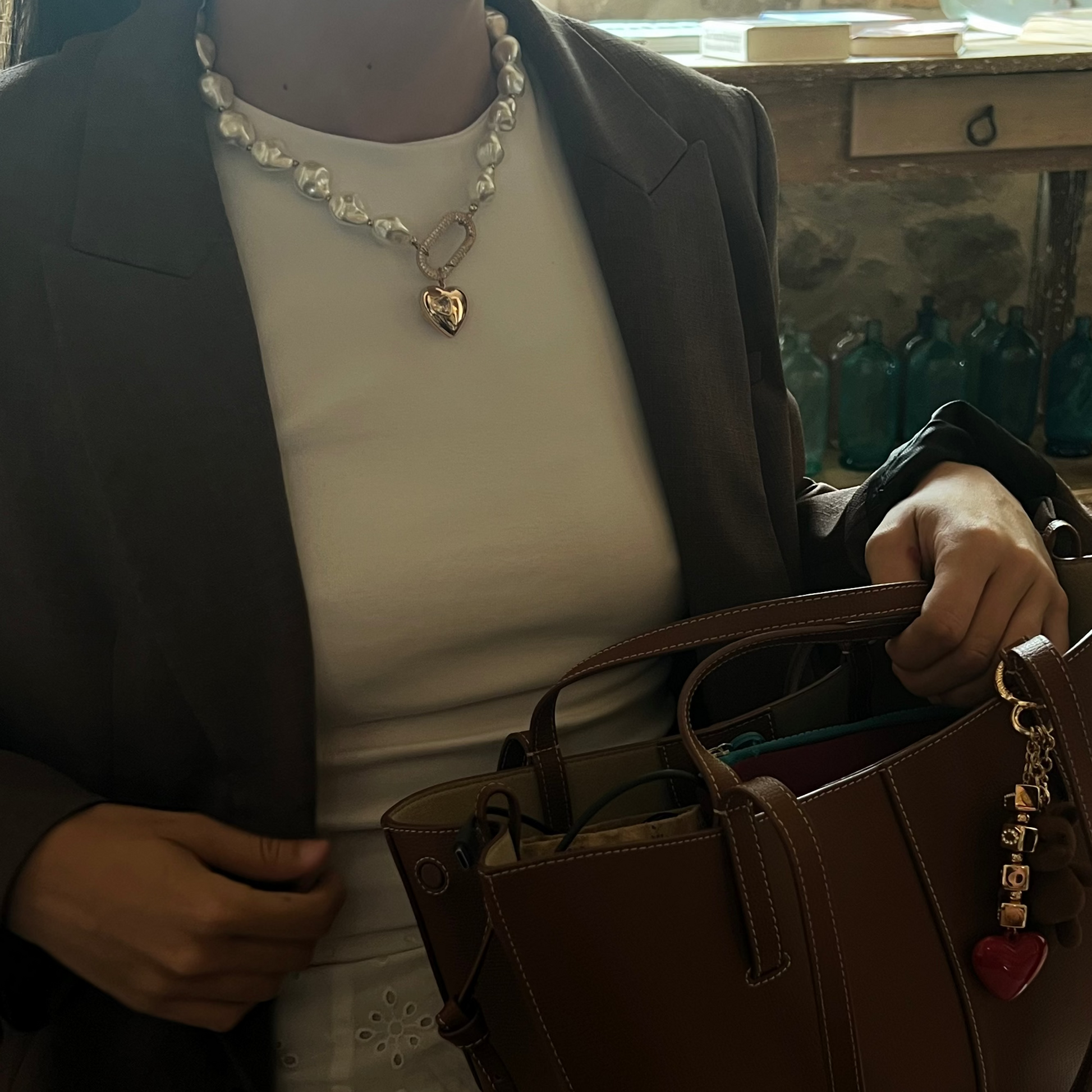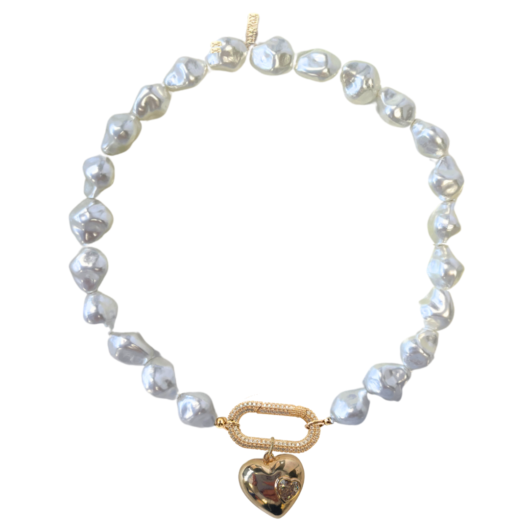 El mix incluye el collar Lua, una cadena de perlas de cristal que evocan pureza y carácter, separadas por pequeñas cuentas doradas que aportan ritmo y equilibrio a la composición. El charm Liora, un corazón dorado bañado en oro de 18 k, encierra en su centro una piedra en forma de corazón que refleja la luz con un brillo casi líquido. No es un diamante, pero lo parece: un pequeño secreto que aporta magnetismo y simbolismo. Puedes completarlo con cualquiera de nuestros enganches bañados en oro de 18 k —Noa, Ona o Kora— para adaptarlo a tu estilo y forma de llevarlo.